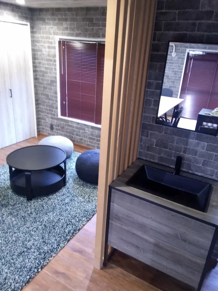 本物のようなレンガ調の壁紙で温かみを演出し、洗面台を中心に木の格子枠を設けました。やわらかな光とぬくもりを感じる、遊び心あふれる空間に仕上げています。